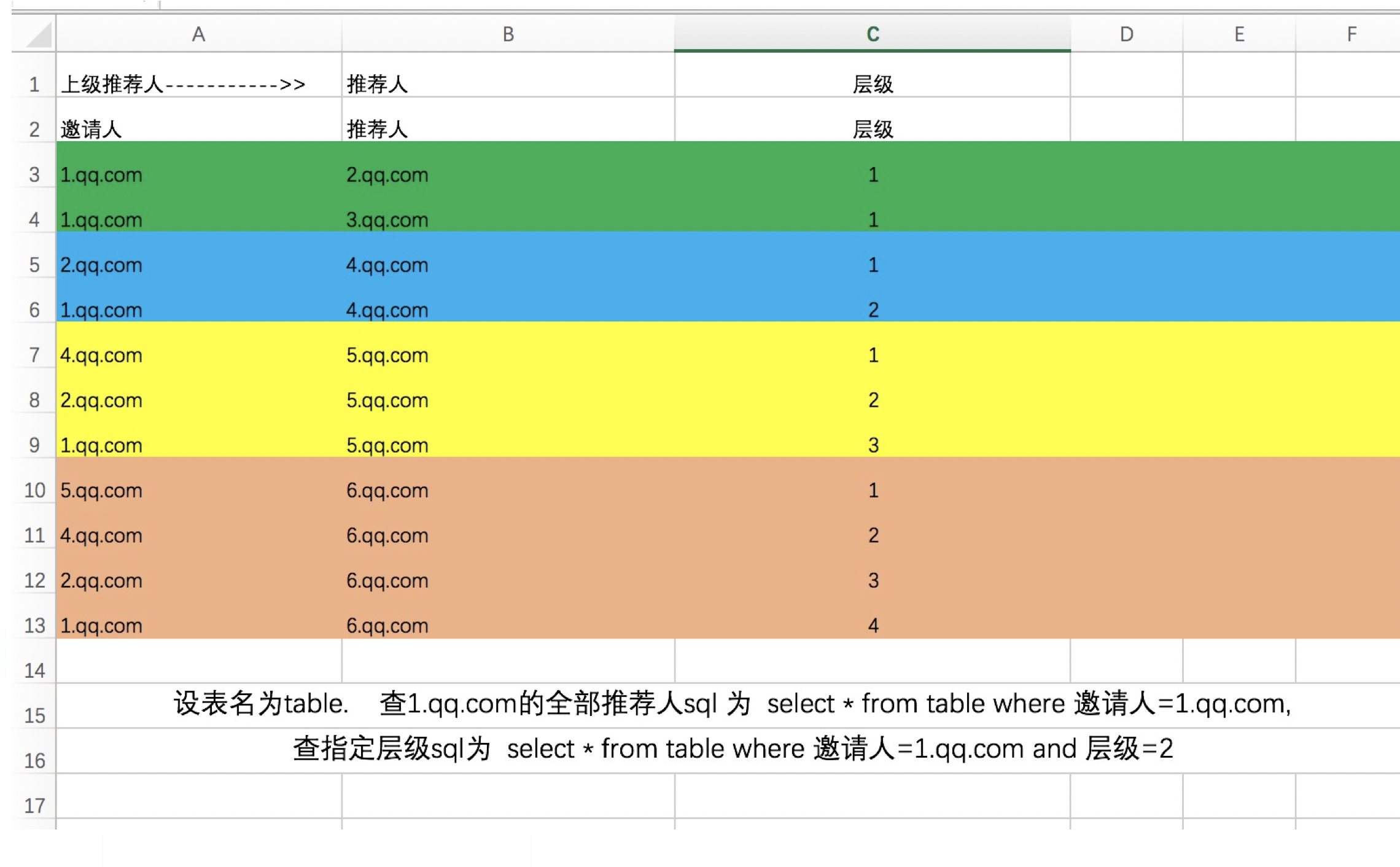 #查询1.qq.com的全部推荐人 select * from table where 邀请人=1.qq.com #查询指定层级的全部推荐人 select * from table where 邀请人=1.qq.com and 层级=2
