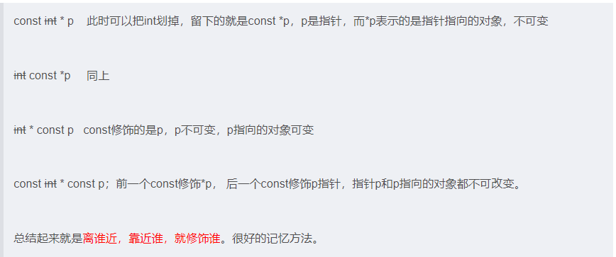 const char * p_value; const修饰右边最近的char, *p_value是不可变得(值不可变),p_value是可变得(地址可变)