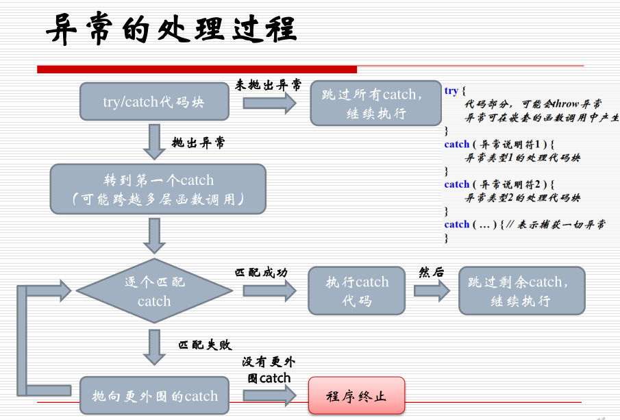 注意异常处理代码最后不需要break语句,同时异常处理可以嵌套,也不必在一个程序内完成对异常的全部处理,可以利用throw交给更高层的异常处理程序。