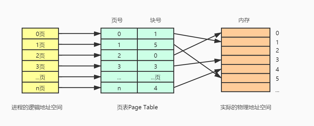 通过页表可以实现地址的转换,假设页面大小为M,若要访问逻辑地址A,首先确定A对于的页号P=A/M ,接着通过页表找到该页号对应的物理块号,假设为B,接着可以确定页内偏移W=A%M,则最终对应的物理地址为 P * M +W。