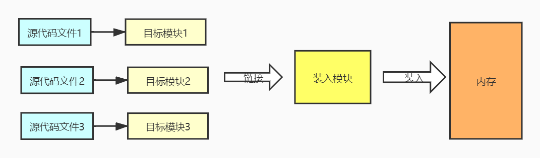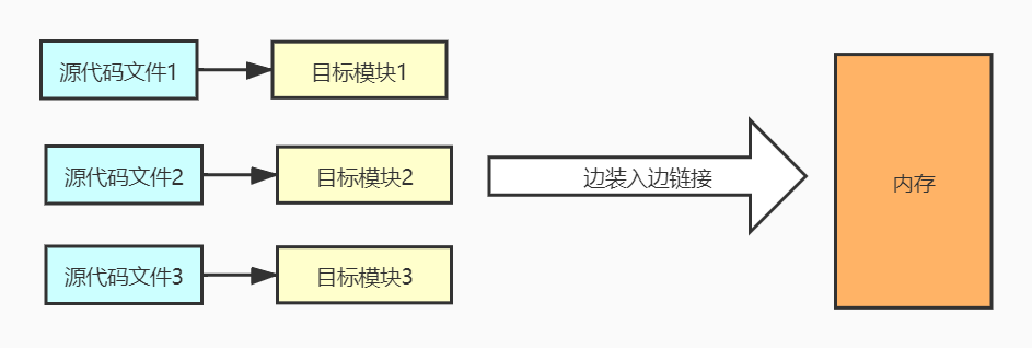 程序执行过程如下(考虑C语言):首先源代码(.c文件)经过预处理,然后在编译器编译后生成汇编代码(.s文件,由汇编语言构成),接着通过汇编器将汇编代码翻译成机器码文件(.o文件),汇编后得到的文件即为二进制文件,然后通过链接器链接,最后得到可执行文件(.out)。但是此时指令中的地址还没有确定下来,因为此时指令中的地址为逻辑地址,而最后执行时需要的是在内存中的真实地址(即物理地址),考虑内存装入时的方式,可以分为3类:
