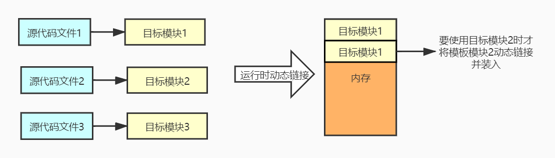 运行时动态链接时在程序执行时发现需要当前模块,于是才对当前模块进行连接,可以和动态重定位结合使用。利用运行时动态链接可以很方便地实现修改和更新,便于实现对目标模块的更新。