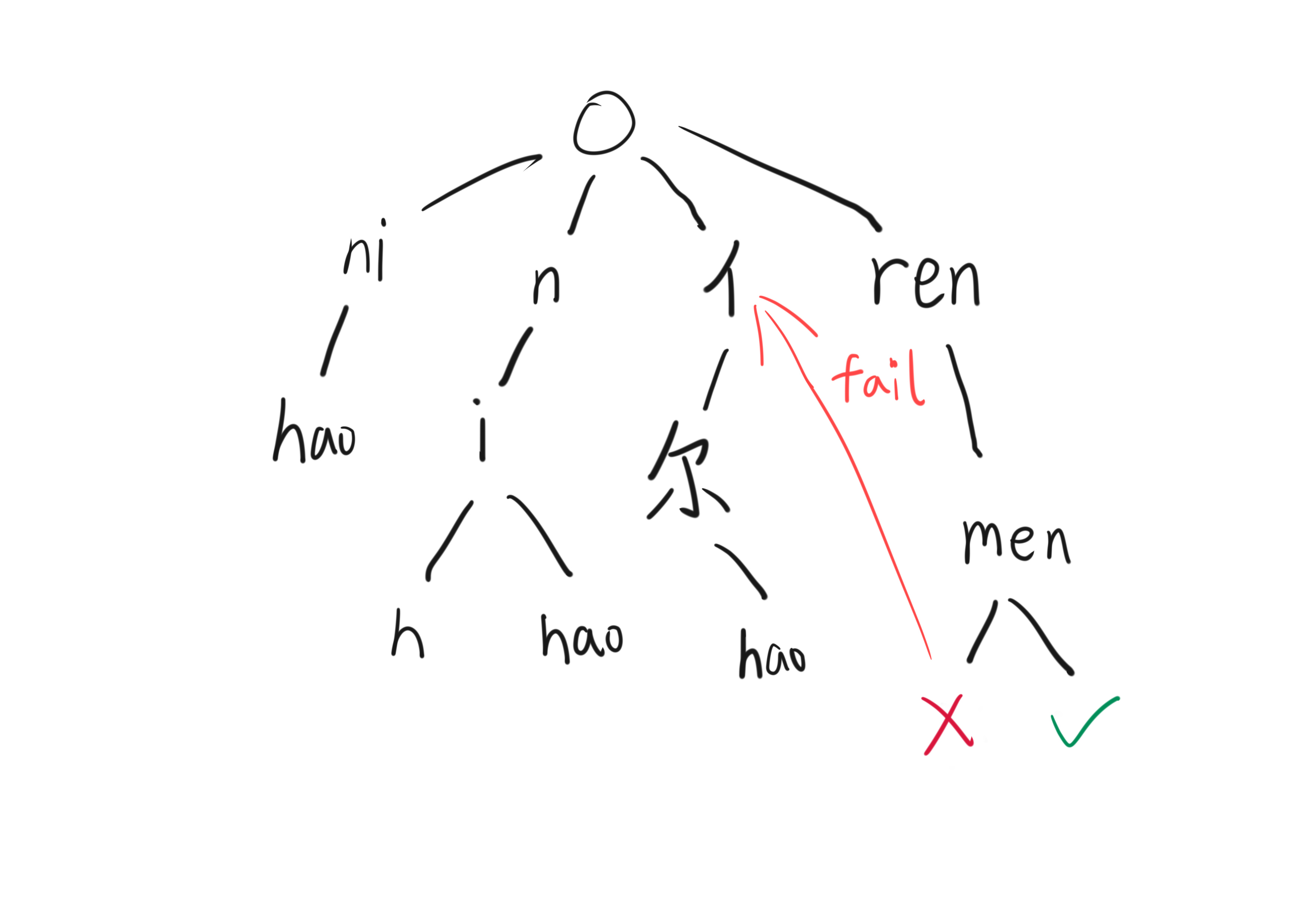 总的来说失配指针只需要实现以下需求:当拼音编码走不通的时候,回忆起刚刚还有一个字形码的分支,然后改到字形码的分支,且自动机回到分支之前的状态再尝试匹配。