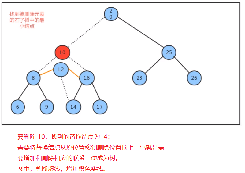 - 删除元素:如果是删除的叶结点好说,但如果删除的是一个中间结点,那树就会散架成为森林,因此需要一个替换结点来代替删除结点的位置,此结点比较合适的就是比删除结点大一点的,也就是右子树的最左节点。过程如图。