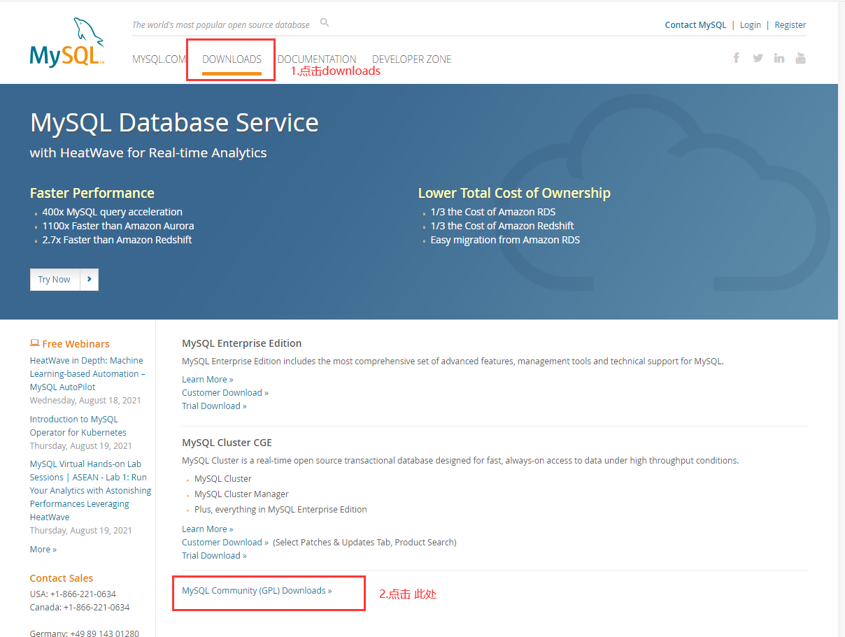 2.点击DOWNLOADS,然后鼠标向下滚动, 点击 MySQL Community (GPL) Downloads