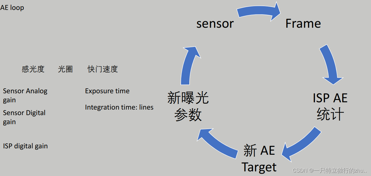 AE模块主要由ISP的AE统计信息模块 + 控制曝光策略的AE算法 两部分组成;AE统计信息主要是硬件模块,一般在lsc/wb之后,主要提供sensor 输入数据的亮度信息,包括亮度直方图和亮度区域统计值;