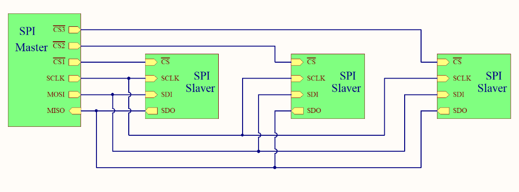 在菊花链模式下,所有从机的片选信号连接在一起,数据从一个从机传播到下一个从机。在此配置中,所有从机同时接收同一SPI时钟。