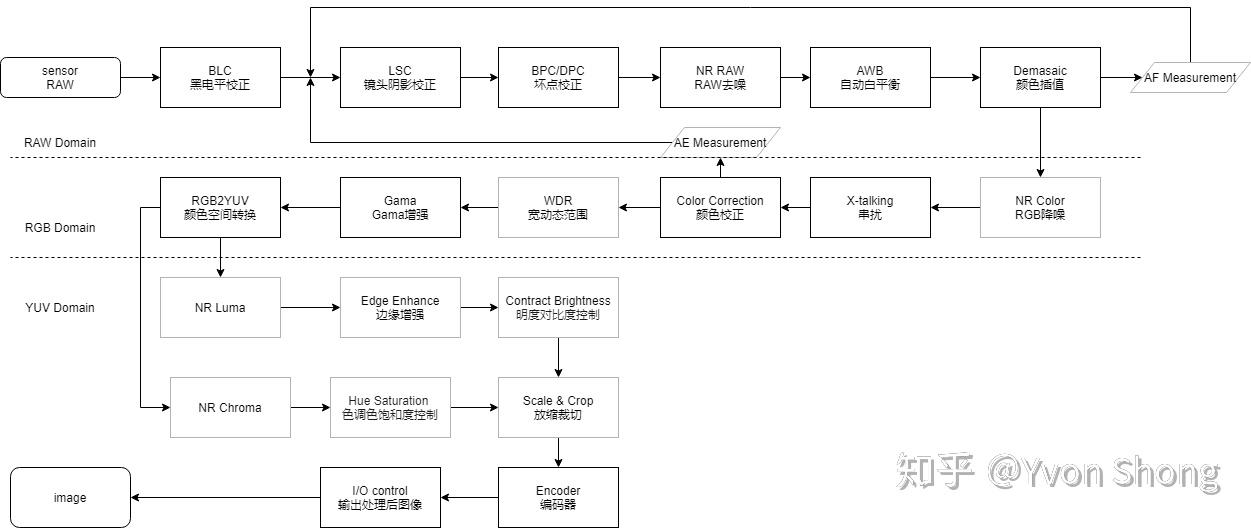 | 5 | AWB | 自动白平衡 | AWB 的统计信息在 RAW 域;校正(增益)应用在 RGB 域。 |