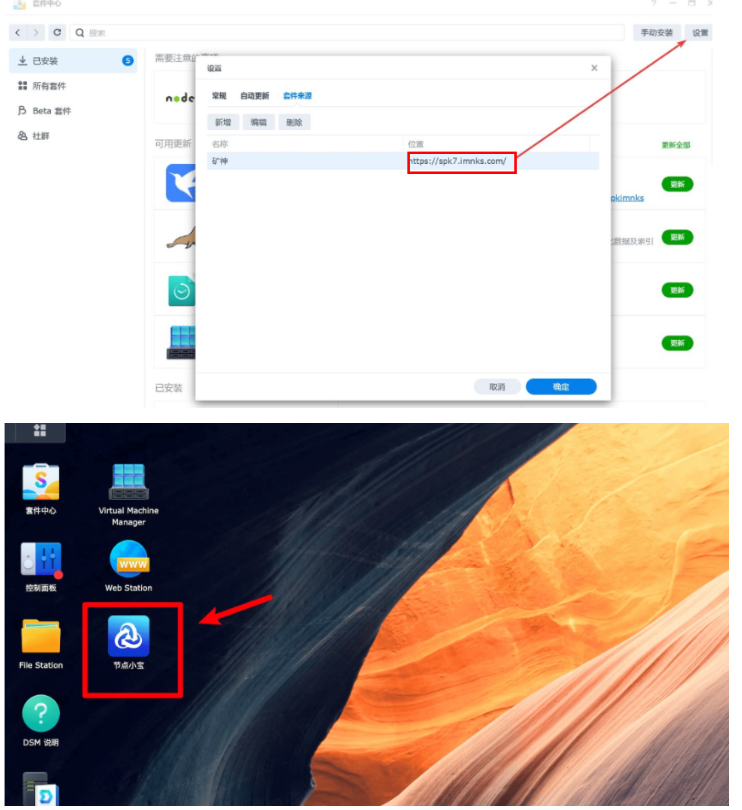 1.安装套件:登录 DSM,在套件中心设置中添加矿神三方源[https://spk7.imnks.com/](http:// https://spk7.imnks.com/),搜索“节点小宝”进行安装。
