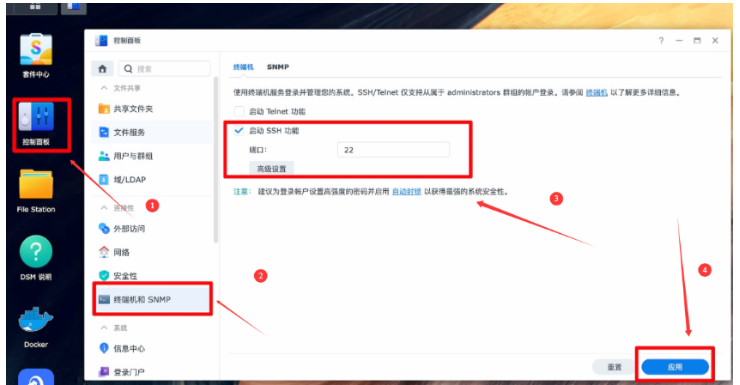 2.底层权限配置:进入“控制面板” -> “终端机” -> “启用 SSH”。使用工具登录后执行命令: