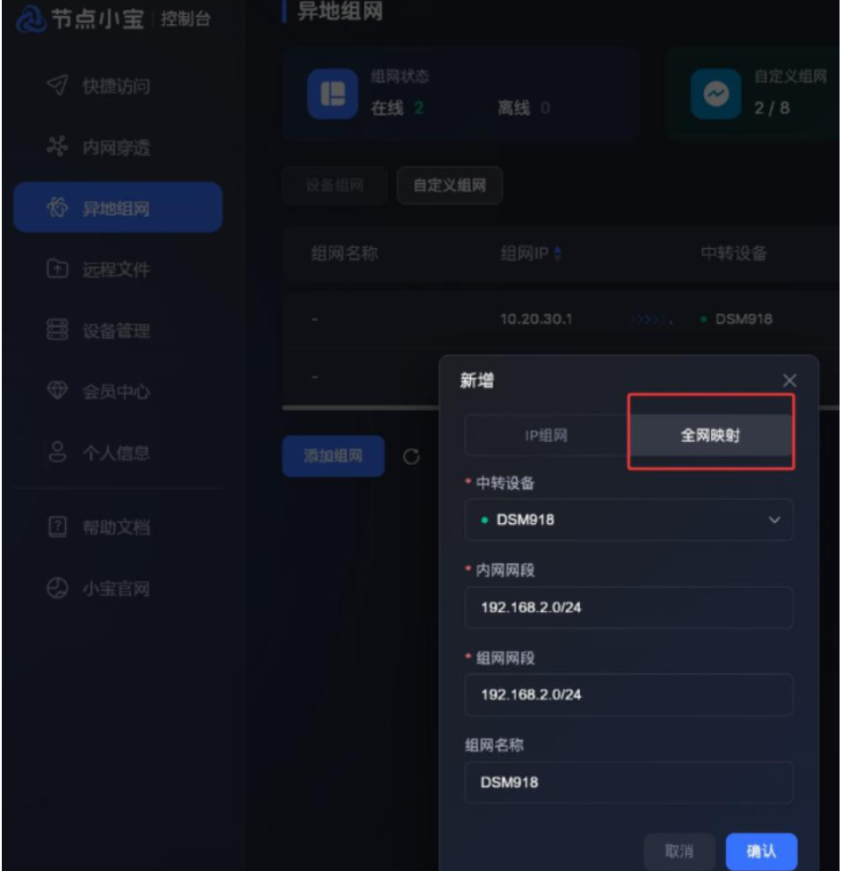 - 操作流程:在节点小宝后台开启“自定义组网”,将家中的真实物理网段(如 192.168.2.0/24)映射到组网中。