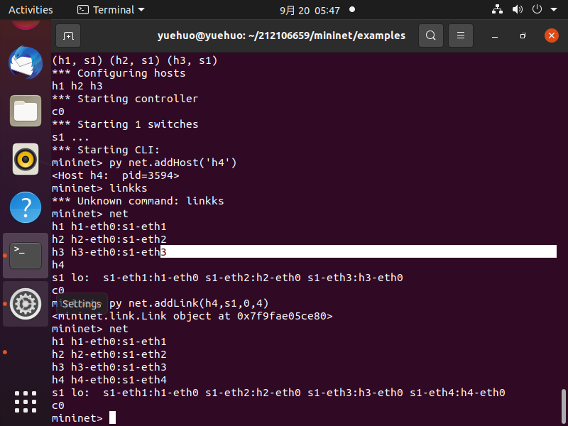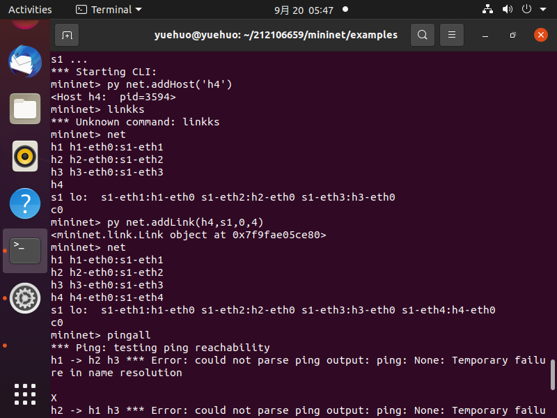 3.在2 b)的基础上,在Mininet交互界面上新增1台主机并且连接到交换机上,再测试新拓扑的连通性。