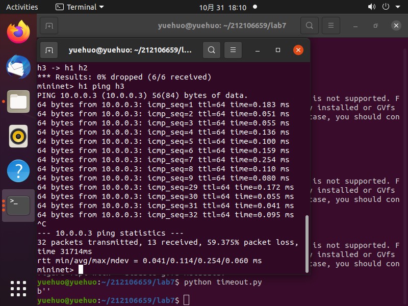 1.(3) 下发硬超时流表,实现拓扑内主机h1和h3网络中断20s:
