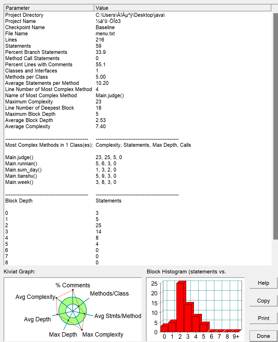由于对刚开始学的类基本没学明白,所以本题都是用面向过程的办法做的,而且代码不长,复杂度也低。从上图数据中也可以看出大部分数值都在正常范围内,没有很复杂的地方。