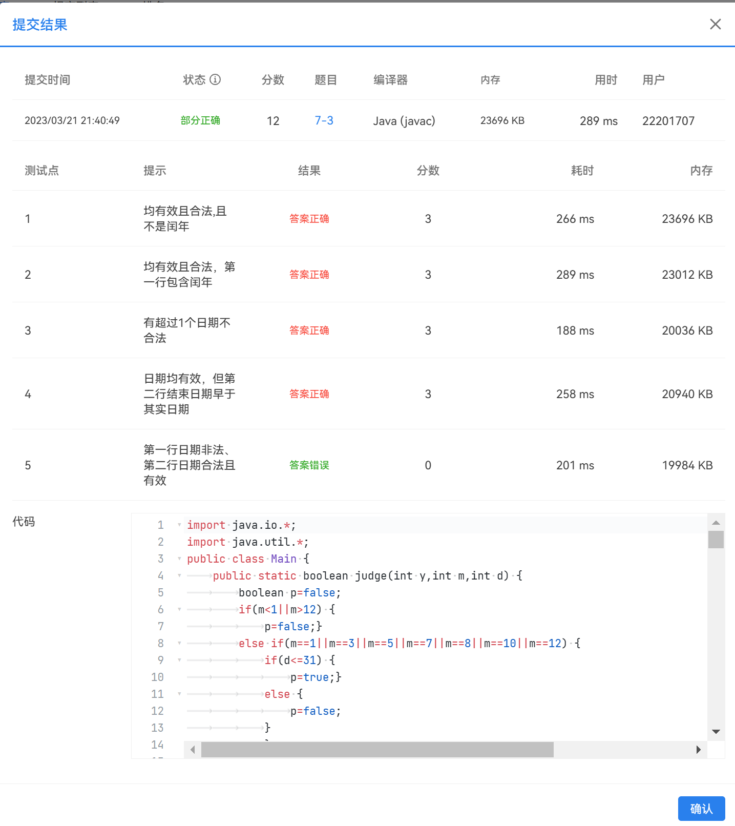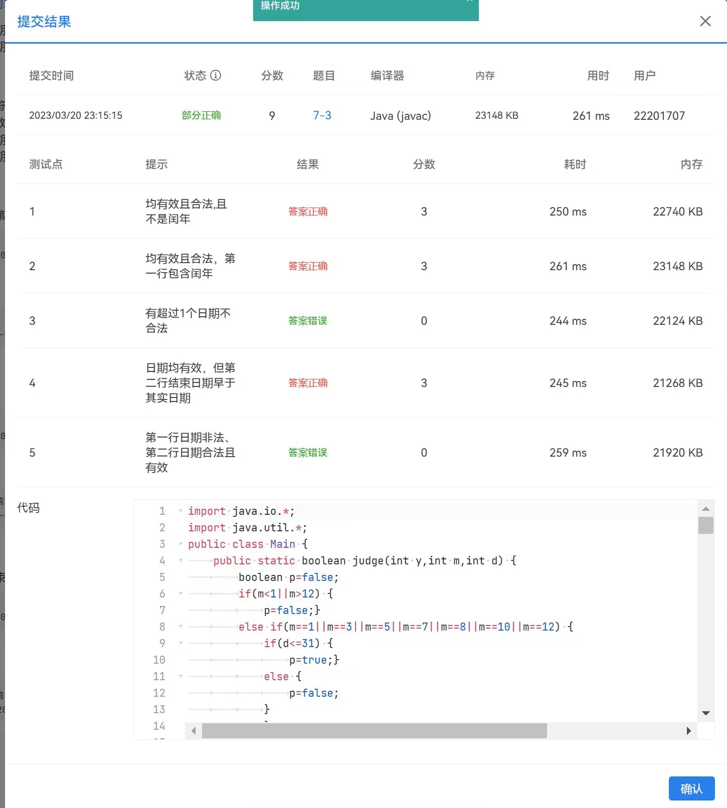 可以看到这段代码对不合法日期不能做出正确的判断,在我后期修改过后最后一个测试点任然过不去,我想应该是if条件判断有问题,和代码复杂度太高有一定的影响。所以才导致测试点一直过不去。