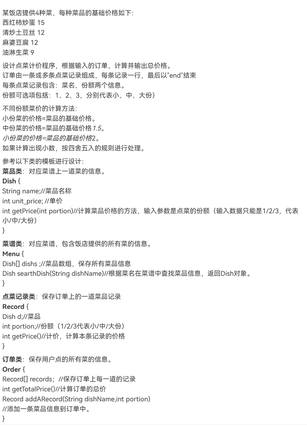 本题与7-2都是菜单计价程序,而7-1比7-2明显简单了许多,因为7-1没有删除功能只是简单的菜单计价程序。此代码需要实现点菜功能以及对菜品的不同的份额进行不同的及结果输出,以及对非法情况的处理。