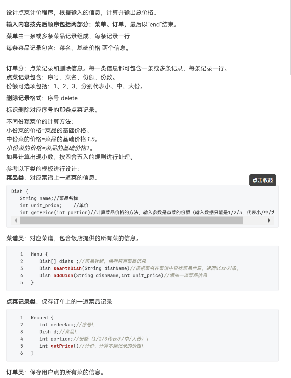 ·此次作业为点菜系统,需要实现对菜单的输出,以及对不同份额的菜品进行计算然后输出,以及对不合法情况的判断以及输出提示。在本题的题干给出了类的设计有部分的提示,但是由于我对类方法的不熟悉,没学明白所以此题还是没有做出来,唉。非常的不应该,原本我以为一个周末应该能做出来,但是我高估了我的水平,一个周末对于我来说压根做不出,只能提交编译都过不了的代码。由于此题目我没有过编译所以给不了在SourceMonitir上代码质量分析结果。