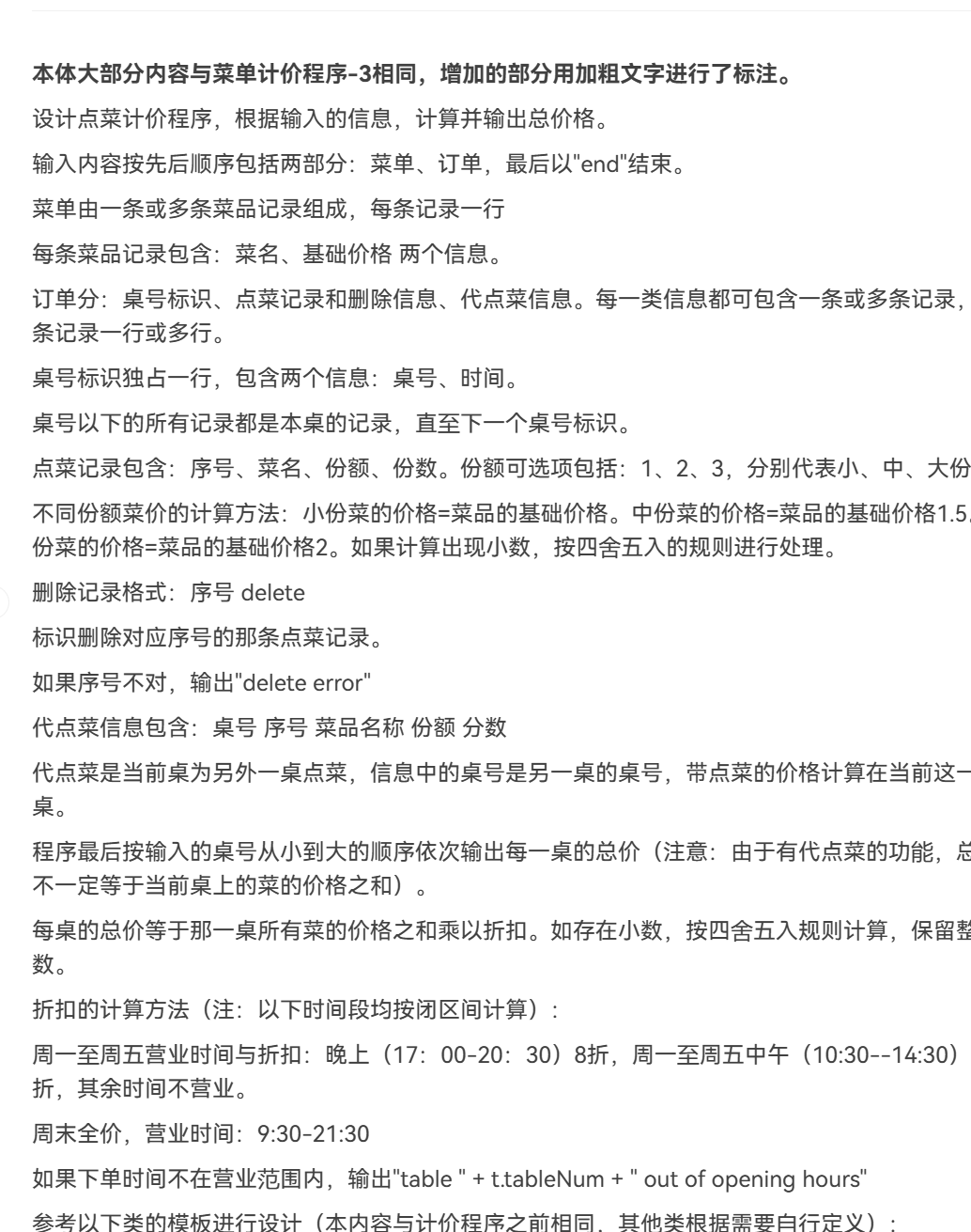这题我写了很久把table order menu dish这些类都设计出来了可是我的主函数有大问题导致我一直报错,在我绞尽脑汁之后无奈选择了混分。用"wrong format混分可是后面也没有混成功