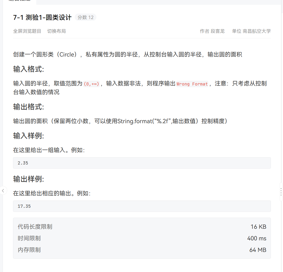 这题是要求我们写一个圆形类输出面积,十分简单直接秒杀