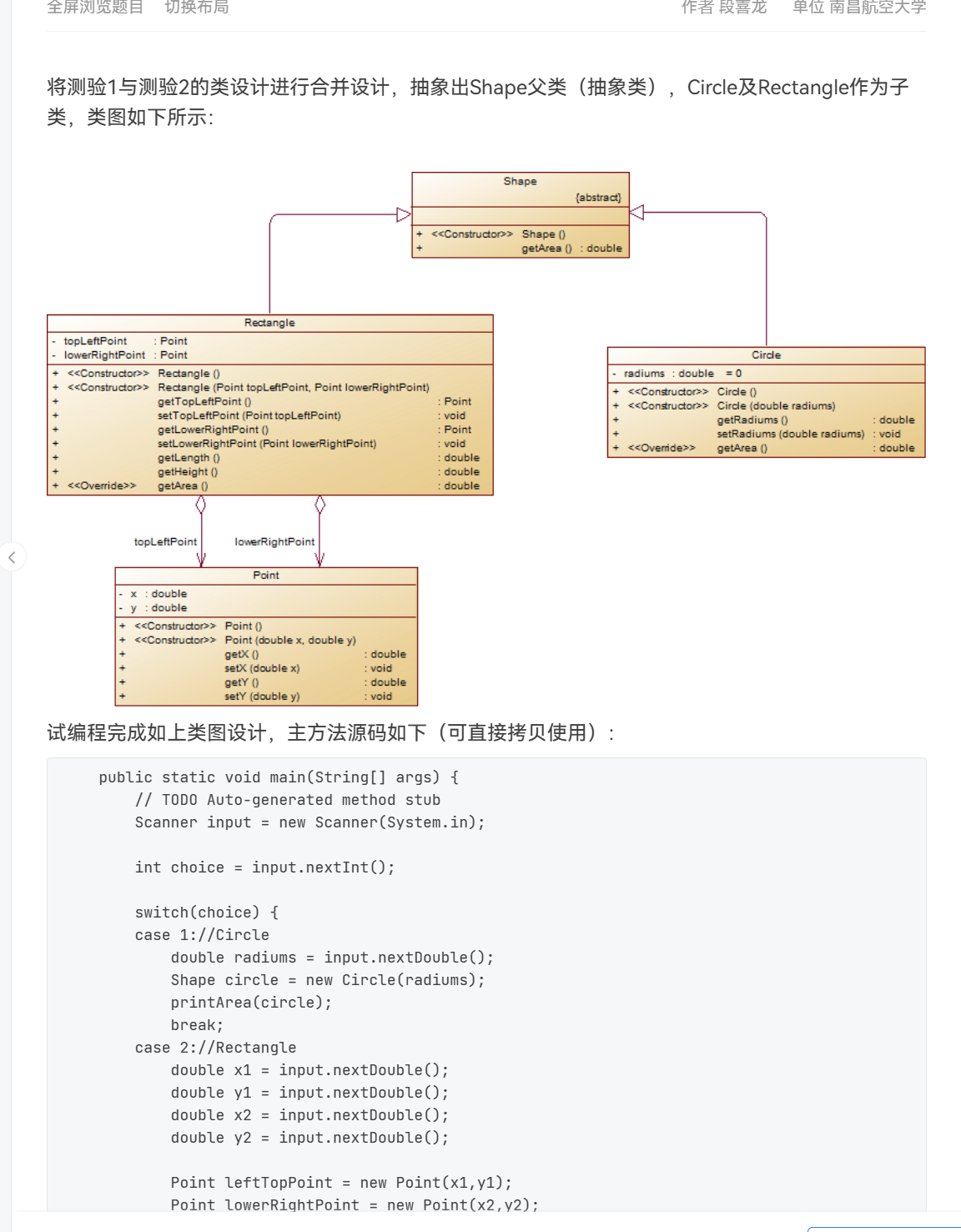 本体结合了前两题的类的设计,综合了前两题,要在其中设计父类。,Circle及Rectangle作为子类。