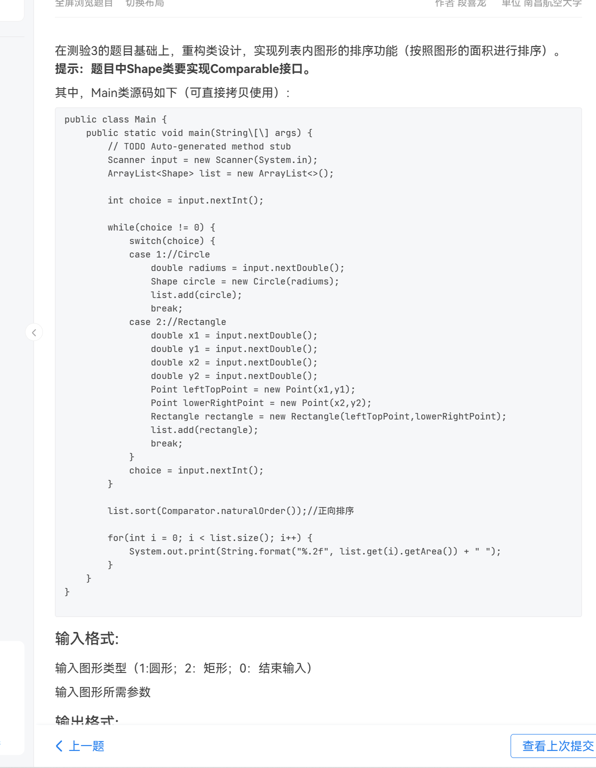 这题在7-3的基础上又增加了一些东西:重构类设计,实现列表内图形的排序功能(按照图形的面积进行排序)而且可以判断多组数据从而输出不同图像的面积。在输出的时候还要按照其面积大小来判断输出顺序。
