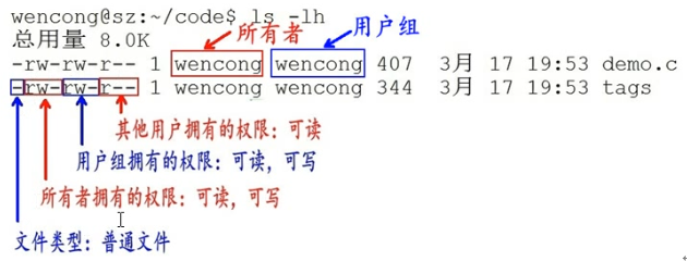 用10个字符来表示文件的权限,比如drwxrwxrwx,其中第一位的d表示文件类型,d就是目录的意思,然后第一组rwx表示文件所有者的权限,第二组rwx是文件所属组的权限,第三组rwx是其它用户的权限。