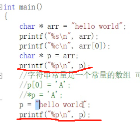 - 比如下边这个例子中,两次把同一个字符串常量给一个指针,打印出来的p对应的地址是相同的。