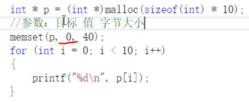- 需要注意的是参数n代表的是字节数,而不是元素数,如下边例子,指针p的类型是int,但是用memset填充的时候的单位是字节,所以,此时只有所有字节置零是有效的操作,如果置1的话就会造成int型存储区域的四个字节是10101010,这样得出来的结果必然不是1。