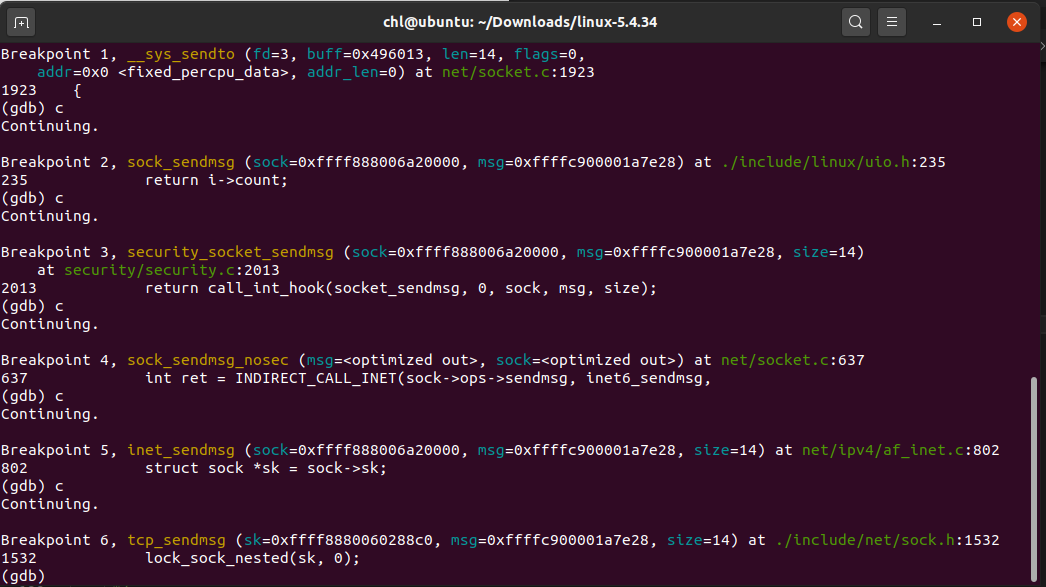 从上述代码和宏定义中可以发现,inet_recvmsg函数是间接调用了tcp_recvmsg或者udp_recvmsg,而这取决于传入的sock->sk->sk_prot中的类型,在本次实验中,socket初始化中,已经将sk_prot定义为tcp_prot,也就是说将会执行tcp_recvmsg()函数。