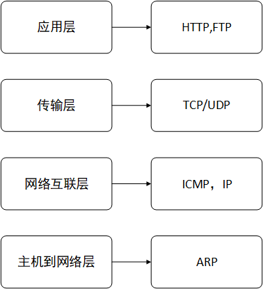 TCP/IP参考模型分为四个层次:应用层、传输层、网络互连层和主机到网络层,如下图所示: