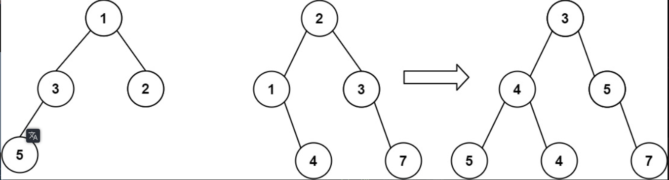 想象一下,当你将其中一棵覆盖到另一棵之上时,两棵树上的一些节点将会重叠(而另一些不会)。你需要将这两棵树合并成一棵新二叉树。合并的规则是:如果两个节点重叠,那么将这两个节点的值相加作为合并后节点的新值;否则,不为 null 的节点将直接作为新二叉树的节点。