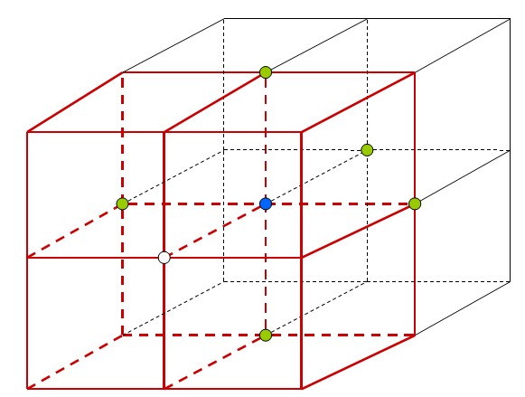 在SMC算法的那部分我们知道,网格生成时的基本单位是体元,其中以同时包含实点和虚点的边界体元最为重要。那么这时候思路就自然而然的形成了:在泛洪法执行过程中,每当遇到边界的时候把与其相关的体元进行标记和存储。这样最后将这些体元集合使用SMC算法抽取三角片就可以生成区域表面的网格。下图示意了发现一个实点和虚点之后,在他们连线上的四个体元均是边界体元,会被记录下来。其中蓝色点表示冲队列中弹出的点,绿色表示其邻域点中的实点,而白色则表示虚点。