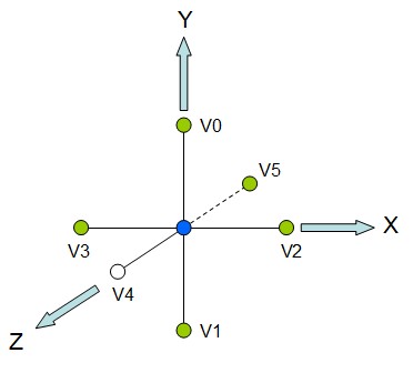 从上诉伪代码描述的过程以及示意图可以看出,一个体元很可能被重复标记,如下图所示的情况。点P(蓝色表示)的邻域点中有两个虚点T(白色表示),这样一个结构中一共就有6个体元需要被标记(红色框出),这样对于这两个T点来说其实就有两个共同的体元需要进行标记。由此我们容易想到,由于一个点P其6邻域的虚实情况是可以枚举的,一共是2的6次方即64种情况,这样可以将这所有64种情况所要标记的体元做成一个查找表,这样就可以根据查找表来方便的获得需要标记的体元。而这64种情况可以仿照MC算法中体元配置的方式进行存储。为此我们特地对一个点的6邻域进行编号,然后把他们的虚实情况对应着一个字节的各个位,如下图表所示: