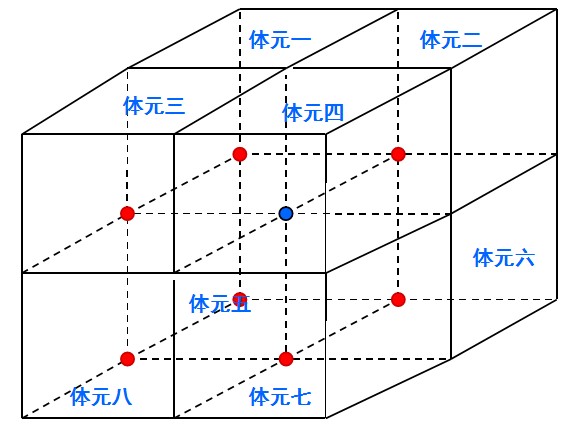 同时我们为那八个体元进行编号。在MC算法介绍里我们使用基准体素来对应一个体元的位置,这样在这里的模型中,八个体元的基准体素的位置用红色标注了出来,这样我们就可以使用一张表来表示基准体素相对P的位置。