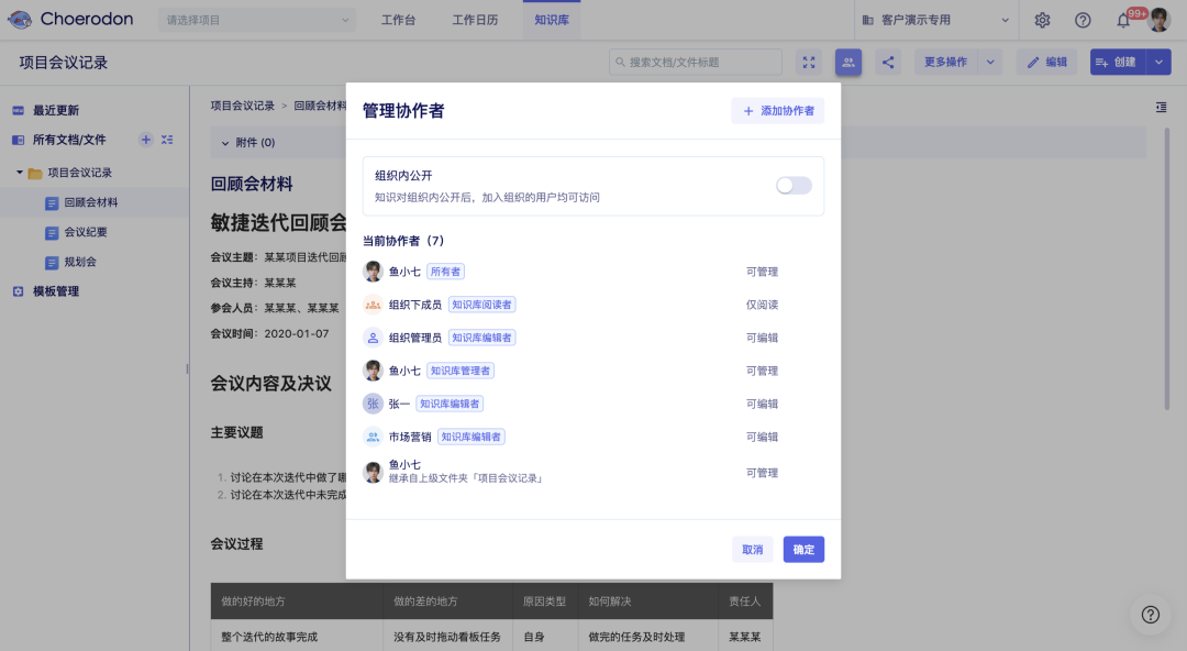 1. 知识库、文件夹、文档、文件支持管理协作者,为多种角色配置不同的读写权限,分工更有序,数据更安全。