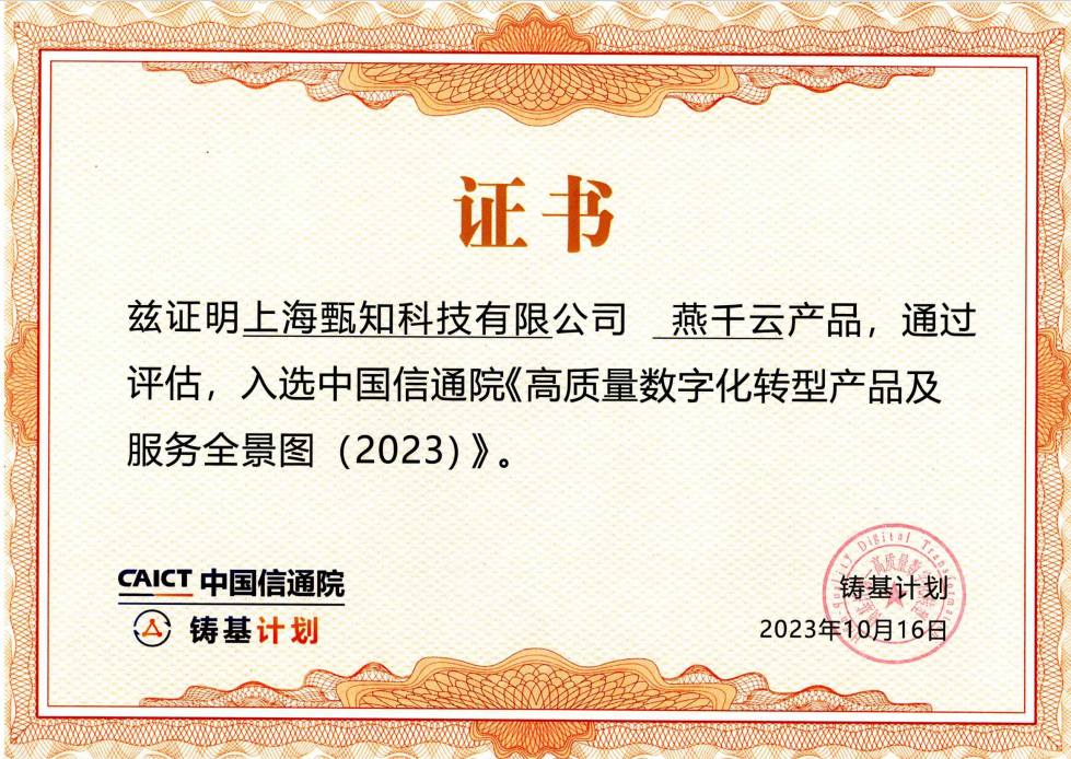 旗下核心产品燕千云被认定为上海市高新技术成果转化项目,并成功入选中国信通院《高质量数字化转型产品及服务全景图》。