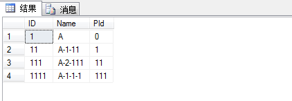 1 --测试A 2 select dbo.F_FindPIdByID(1111) as 'ID' 3 4 --测试B 5 select dbo.F_FindPIdByID(21) as 'ID' 6 7 --测试C 8 select dbo.F_FindPIdByID(31) as 'ID'