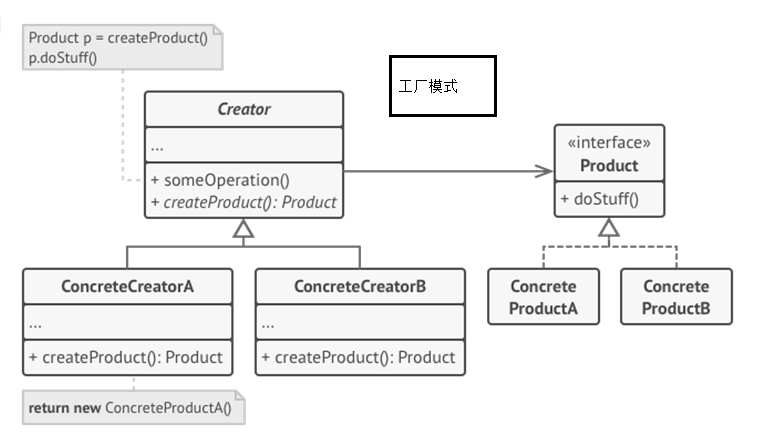 /** * 简单工厂 * */ public class time{ public static void main(String[] args) { IProduct product = Factory.createProduct(ProductType.ProductB); product.operation(); } } abstract class Factory{ public static IProduct createProduct(ProductType productType) { IProduct product = null; switch (productType) { case ProductA: product = new ProductA(); /** 可以进行些初始化 */ break; case ProductB: product = new ProductB(); /** 可以进行些初始化 */ break; default: break; } return product; } } interface IProduct{ void operation(); } class ProductA implements IProduct{ public void operation() { System.err.println(this.getClass()); } } class ProductB implements IProduct{ public void operation() { System.err.println(this.getClass()); } } enum ProductType{ ProductA,ProductB; }