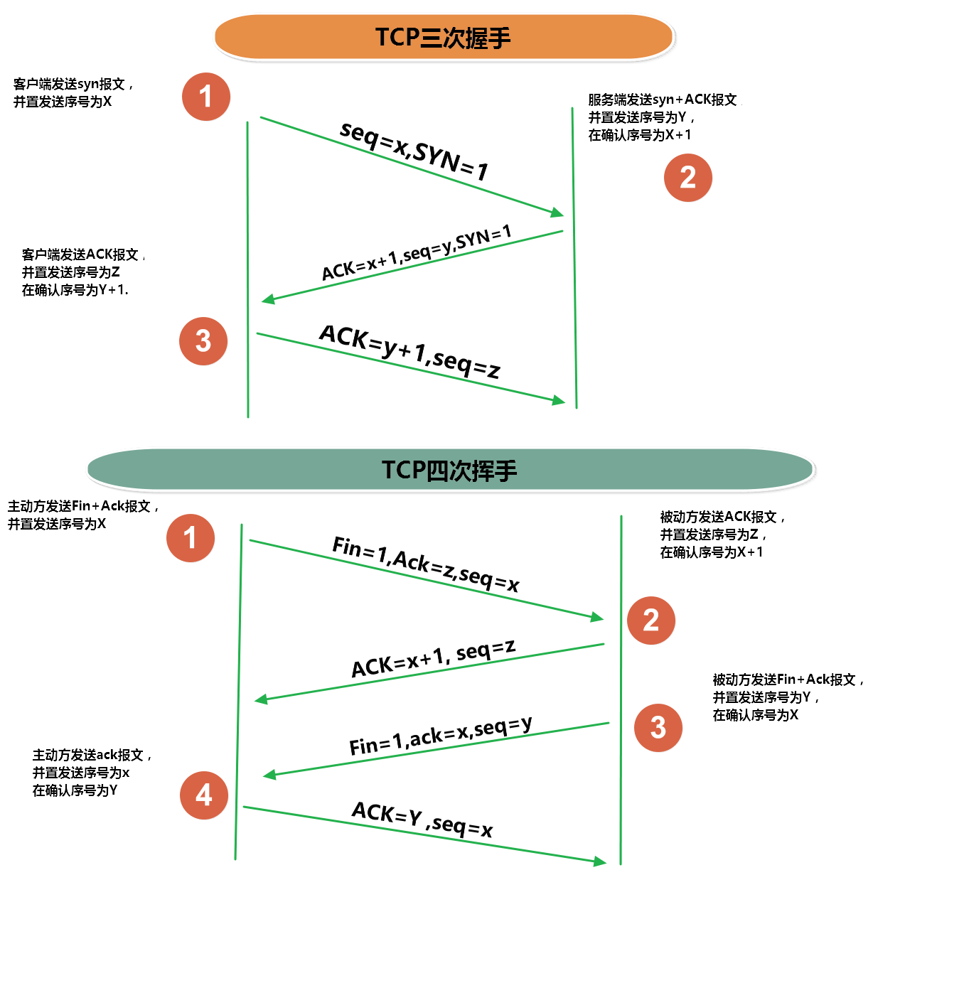 #TCP是因特网中的传输层协议,使用三次握手协议建立连接。当主动方发出SYN连接请求后,等待对方回答SYN+ACK[1],并最终对对方的 SYN 执行 ACK 确认。这种建立连接的方法可以防止产生错误的连接。[1] #TCP三次握手的过程如下: #客户端发送SYN(SEQ=x)报文给服务器端,进入SYN_SEND状态。 #服务器端收到SYN报文,回应一个SYN (SEQ=y)ACK(ACK=x+1)报文,进入SYN_RECV状态。 #客户端收到服务器端的SYN报文,回应一个ACK(ACK=y+1)报文,进入Established状态。 #三次握手完成,TCP客户端和服务器端成功地建立连接,可以开始传输数据了。
