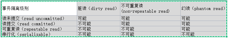 脏读(Dirty Read) 一个事务读取到另一个事务还没提交的数据叫脏读。 例如,事务A修改了一行数据,但没有提交,事务 B读取了被事务A修改后的数据,之后事务A因为某种原因Rollback了,那么事务B读取的数据就是脏的。 幻读(Phantom Read) 事务在操作过程中进行两次查询,第二次查询的结果包含了第一次查询中未出现的数据或者缺少了第一次查询中出现的数据。 例如,A和B事务并发执行,A事务查询数据,B事务插入或者删除数据,A事务再次查询发现结果集中有以前没有的数据,或者以前有的数据消失了,仿佛出现了幻觉。 幻读经常发生在insert操作。 不可重复读(NonRepeatable Read) 一个事务先后读到另一个事务提交之前的数据和已提交的更新数据。 A和B事务并发执行,A事务查询数据,然后B事务更新该数据,A再次查询该数据时,发现该数据变化了。 不可重复读经常发生在update和delete操作。读未提交(Read Uncommitted) 读事务不阻塞其他读事务和写事务,未提交的写事务阻塞其他写事务但不阻塞读事务。 此隔离级别可以防止更新丢失,但不能防止脏读、不可重复读、幻读。 读已提交(Read Committed) 读事务允许其他读事务和写事务,未提交的写事务禁止其他读事务和写事务。 读未提交可以防止更新丢失、脏读,但不能防止不可重复读、幻读。 可重复读(Repeatable Read) 以操作同一行数据为前提,读事务禁止其他写事务但不阻塞读事务,未提交的写事务禁止其他读事务和写事务。 此隔离级别可以防止更新丢失、脏读、不可重复读,但不能防止幻读。 可串行化(Serializable) 提供严格的事务隔离,它要求事务序列化执行,事务只能一个接着一个地执行,不能并发执行。 此隔离级别可以防止更新丢失、脏读、不可重复读、幻读。 如果仅仅通过“行级锁”是无法实现事务序列化的,必须通过其他机制保证新插入的数据不会被刚执行查询操作的事务访问到。 - 数据库事务四个基本要素ACID