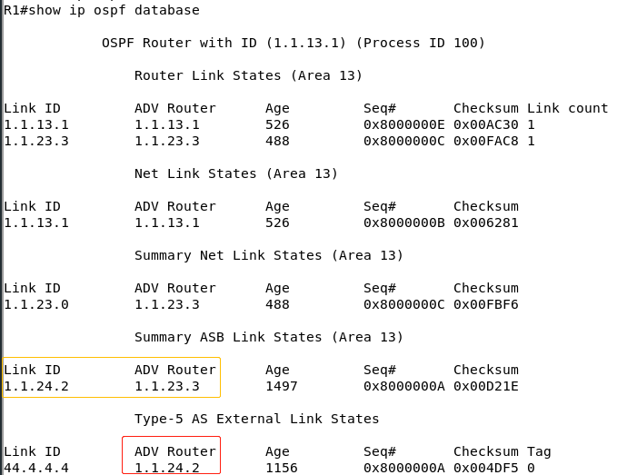 这时候LSA4就有用了,LSA4的这个条目(黄框)的意思是:要找RID是1.1.24.2的路由器,就先找ADV ID是1.1.23.3的路由器,而这台路由器就是R3(ABR),R3和R1是13区域的邻居关系,所以R1要先发送数据到R3,而R3又和R2是骨干区域的邻居关系,所以R3能够找到R2,这就是为什么R3是下一跳的原因。