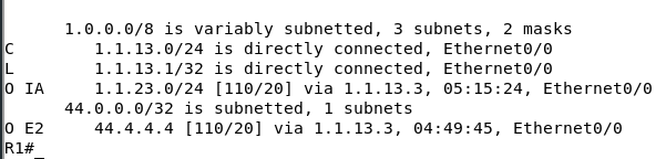 图中,R1、R2、R3跑OSPF,R1和R3在13区域,R2和R3在骨干区域,R2重分布44.4.4.4的静态路由到OSPF。