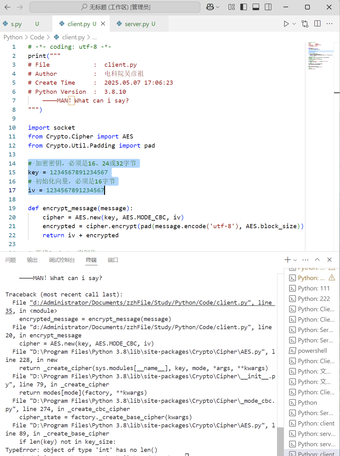 它告诉我,我这样key和iv的类型是字符串类型,而非字节类型,需添加前缀b直接声明为字节,才符合16字节的要求!