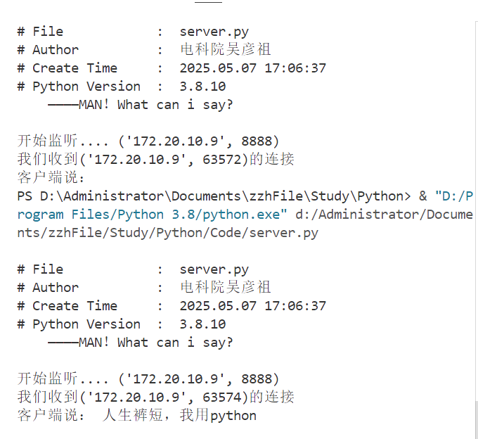 (1)创建服务端和客户端,选择一个通信端口,用Python语言编程实现通信演示程序;