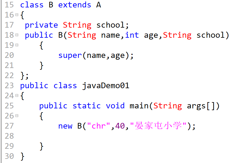 因为类B中只有系统默认为无参的构造函数,他会调用父类A中的无参构造函数,所以会出现上面的错误提示。上述程序可以改造为一下程序: