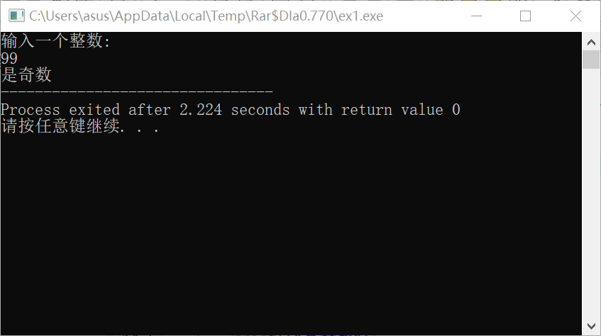 // 程序功能: // 要求用户从键盘输入一个整数,判断其是奇数还是偶数 #include <stdio.h> int main() { int x; printf("输入一个整数: \n"); scanf("%d",&x); // 在×××处填写相应表达式 // 使得当表达式成立时,判定x是奇数,否则是偶数 if(x%2==1) printf("是奇数"); else printf("是偶数"); return 0; }
