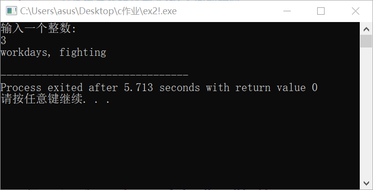 /* 程序功能: 要求用户从键盘输入1~7之间的整数 如果输入的是1~5, 提示用户是工作日,要努力工作; 如果输入的是6或7,提示用户是休息日,放松休息; 否则,提示用户输入不在合法范围 */ #include <stdio.h> int main() { int days; printf("输入一个整数: \n"); scanf("%d",&days); // 补足×××处的表达式,使得满足程序功能描述 if(days>=1&&days<=5) // days在1到5之间 printf("workdays, fighting\n"); else if(days==6||days==7) // days是6或7 printf("weekend, relax~\n"); else printf("Ooops, not in 1~7\n"); return 0; }