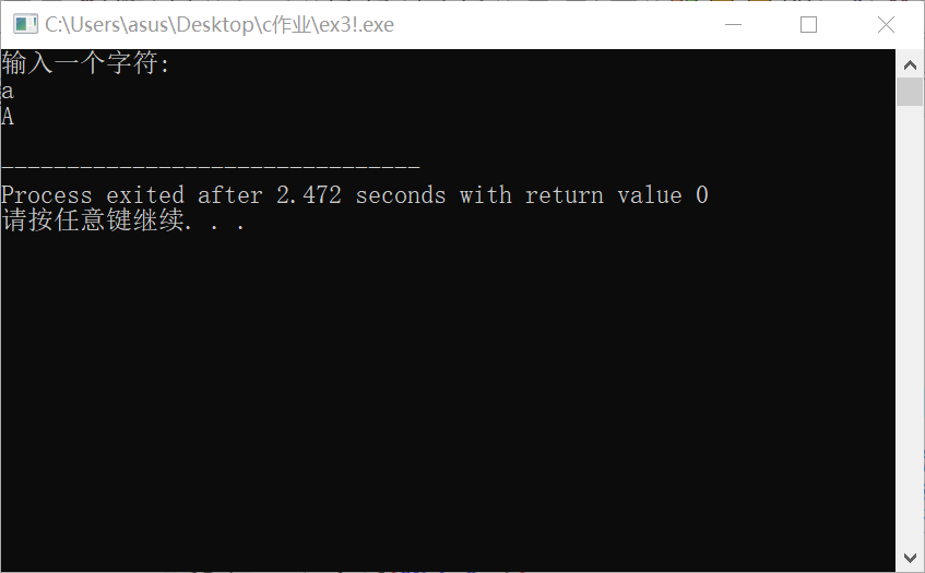 // 功能: // 从键盘上输入单个字符 // 如果是小写字母,则转换成大写后输出 // 否则,什么也不做,原样输出 #include <stdio.h> int main() { char ch; printf("输入一个字符:\n"); scanf("%c",&ch); // 根据程序功能描述,补足程序 if(ch>='a'&&ch<='z') // 如果ch是小写字母,补足判定ch是小写字母的表达式 ch=ch-'a'+'A'; // 补足把ch中的小字母转换成大写字母的表达式语句 // 说明:语句就是在表达式末尾加分号; printf("%c\n",ch); return 0; }