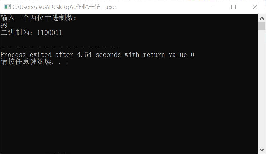 #include<stdio.h> int main() { printf("输入一个两位十进制数:\n"); int x,a,b,c,d,e,f,g ; scanf("%d",&x); a=x%2; /*除二取余,a,b,c,d,e,f,g作为余数 */ x=x/2; b=x%2; x=x/2; c=x%2; x=x/2; d=x%2; x=x/2; e=x%2; x=x/2; f=x%2; x=x/2; g=x%2; x=x/2; printf("二进制为:%d%d%d%d%d%d%d\n",g,f,e,d,c,b,a); /*倒序输入*/ return 0; }