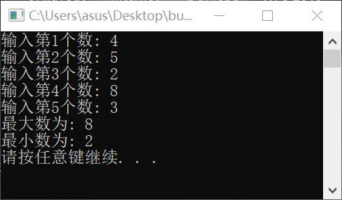 #include <stdio.h> #include <stdlib.h> int main() { int number, max, min, n; n=1; printf("输入第%d个数: ", n); scanf("%d", &number); max = number; min = number; while(n<5) { n++; printf("输入第%d个数: ", n); scanf("%d", &number); if(number>max) max = number; else if(number<min) min = number; } printf("最大数为: %d\n", max); printf("最小数为: %d\n", min); system("pause"); return 0; }
